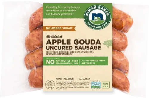 This is the #1 selling pork sausage in natural grocery stores across the country! That could be because apples and cheese make a perfect pair. We brought the two together to make our apple gouda uncured sausage with whole muscle cuts of our all-natural pork combined with real ingredients.