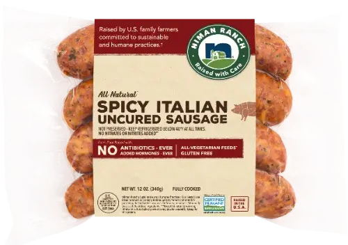 Time-honored Italian seasonings of fennel and garlic with an added kick of crushed red pepper are what gives our Spicy Italian sausage its authentic flavor. Only whole muscle cuts of all-natural pork are used to make this sausage.