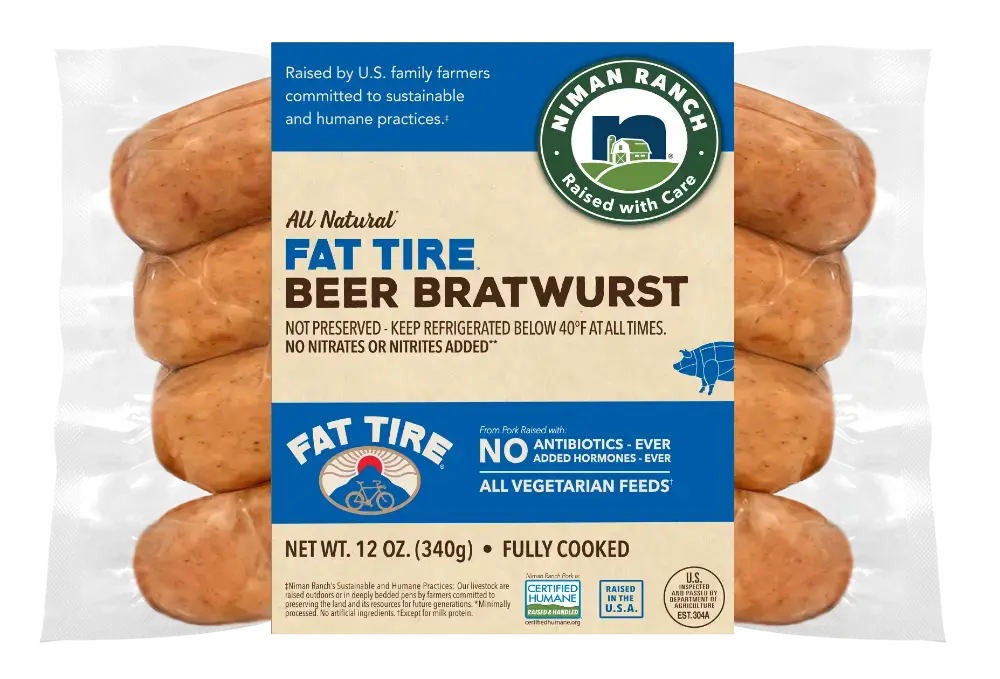 Niman Ranch’s all natural pork bratwurst is enhanced by the gentle sweetness and fresh hop bitterness from New Belgium Brewing’s Fat Tire Amber Ale. The result is a well-balanced, juicy sausage with a distinct beer finish.